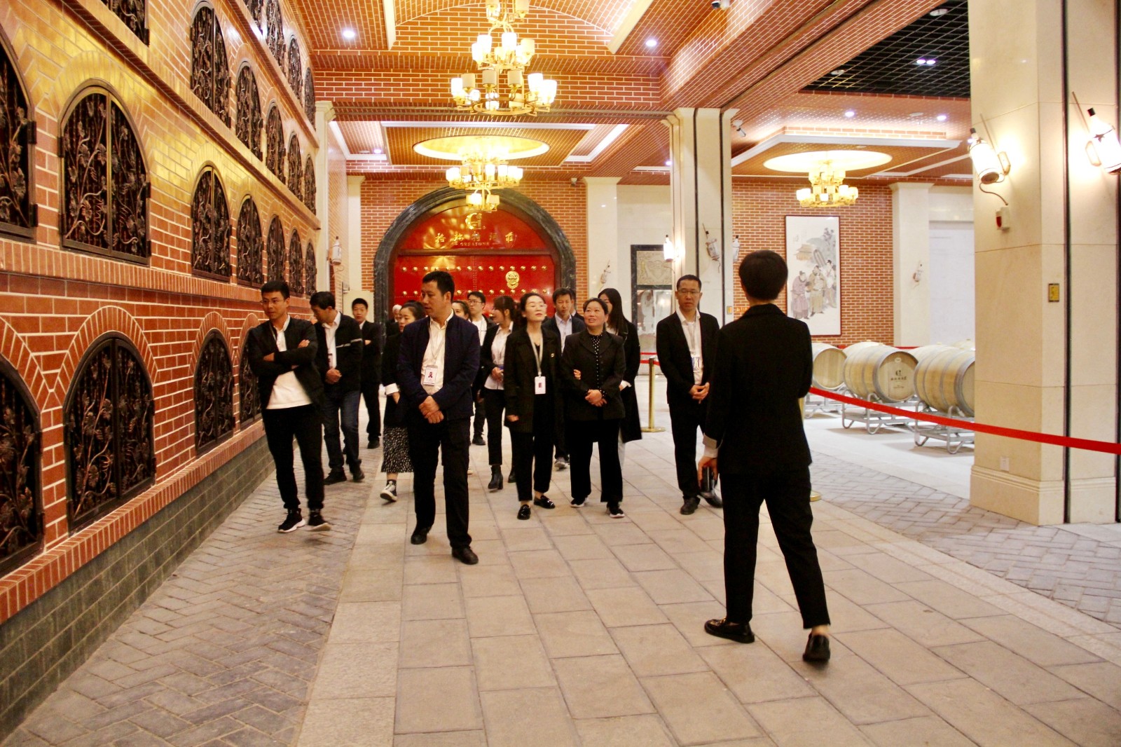 合影結束之后,專業講解員帶領嘉賓們來到了接待中心,接待中心整體以歐式建筑風格為主,內設有產品展示區、商務洽談室、專業紅酒品鑒區以及冷餐制作區等。